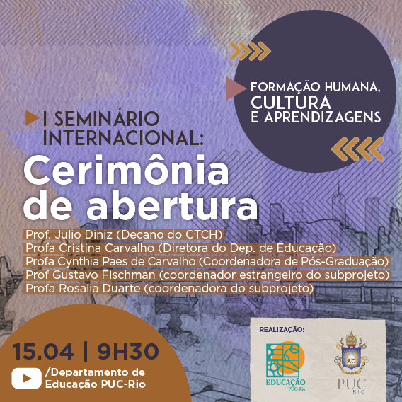 Conforme anunciei anteriormente, o Departamento de Educação da PUC-Rio realizará em 15 e 16 de abril o I Seminário Internacional de seu projeto de internacionalização Formação Humana, Cultura e Aprendizagens, coordenado pela Profa. Rosália Duarte. O projeto, financiando pelo Programa Capes-Print, articula pesquisas de professores do PPGE/PUC-Rio desenvolvidas em interlocução com colegas de instituições estrangeiras.